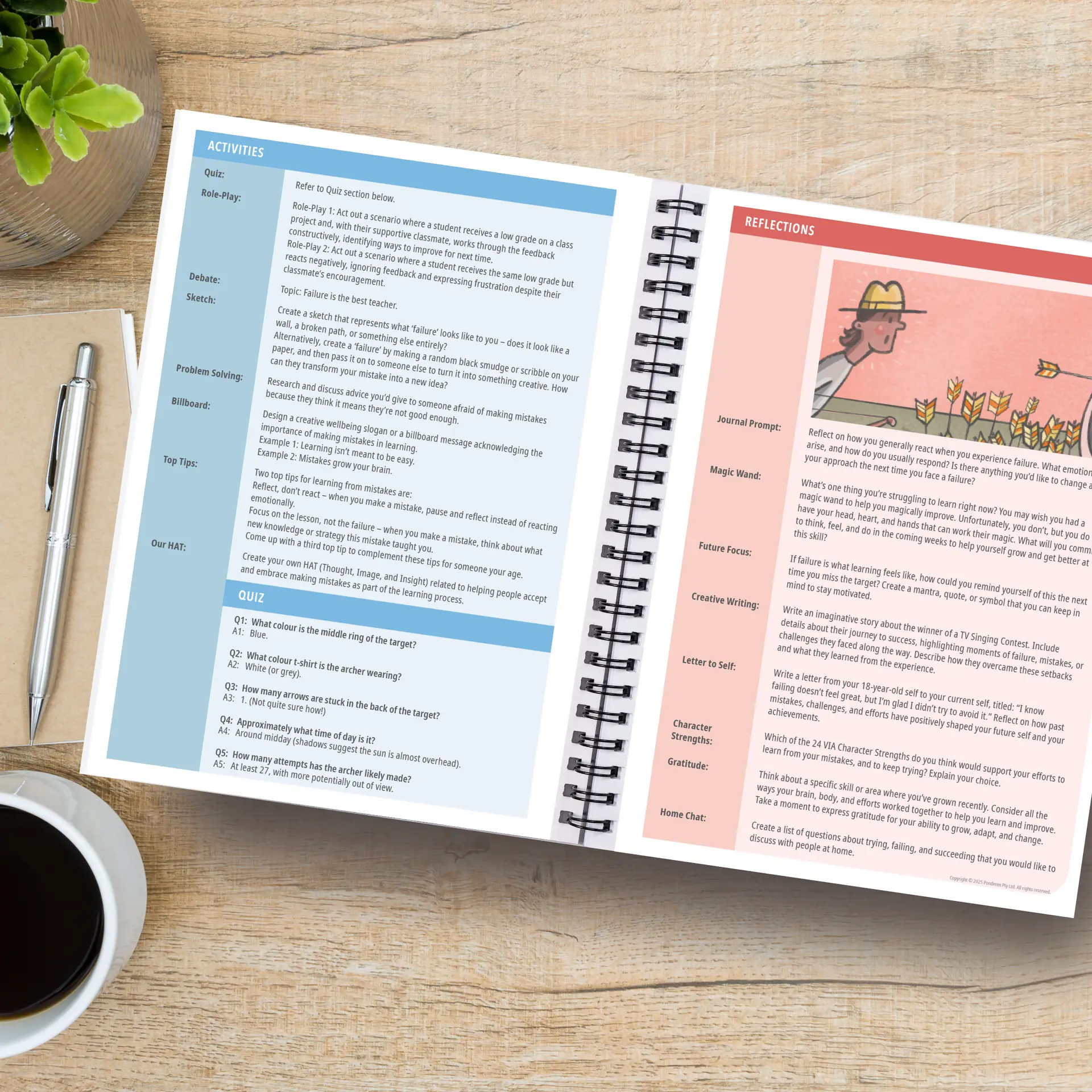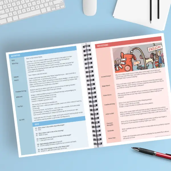 - Second spread: A breakdown of all eight activities, quiz questions and answers, and detailed reflection prompts.
